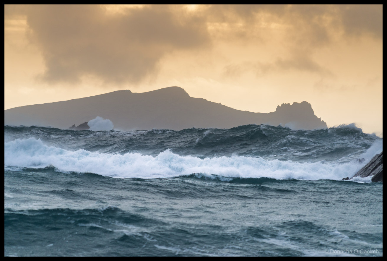 On a calm day you can sit on Clogher Beach and see An Fear Marbh lying peacefully on the horizon, its profile supposedly resembling a body laid out in repose. On a day like this, though, you’re lucky to see it at all. The swell was stacking up in layers, each wave tall enough to swallow the base of the island entirely, leaving just the dark ridge floating above a wall of spray and foam. That golden light breaking through the cloud behind it was almost unfairly cinematic, the kind of scene where you fire off a dozen frames and hope at least one captures what your eyes were actually seeing. The Dingle Peninsula has no shortage of dramatic viewpoints, but Clogher looking west towards the Blaskets in rough weather is hard to beat.