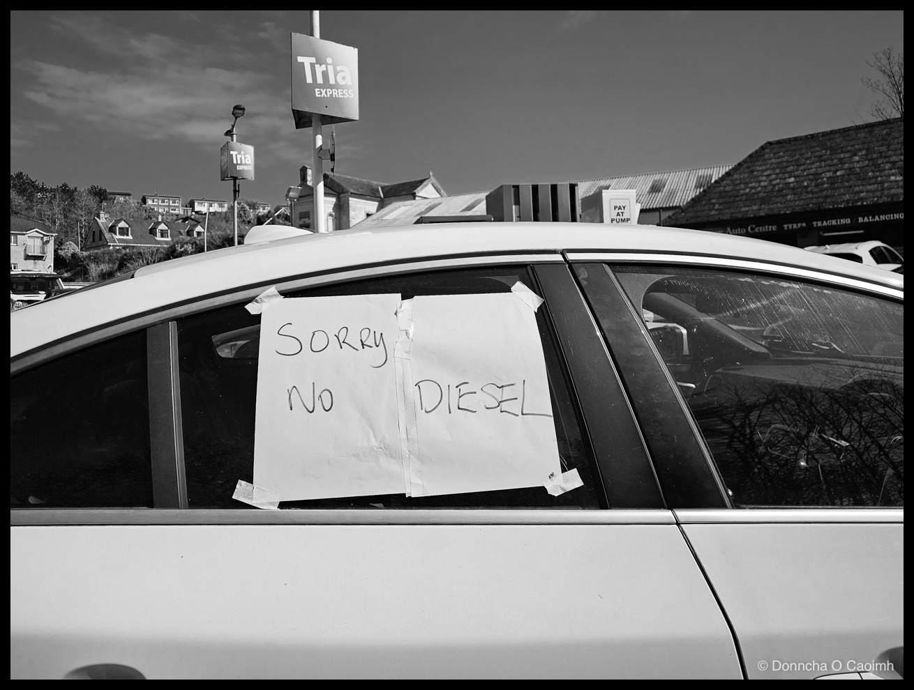 I walked past Blarney Autos this morning and clocked the “SORRY NO DIESEL” sign on a car blocking the diesel pumps there.