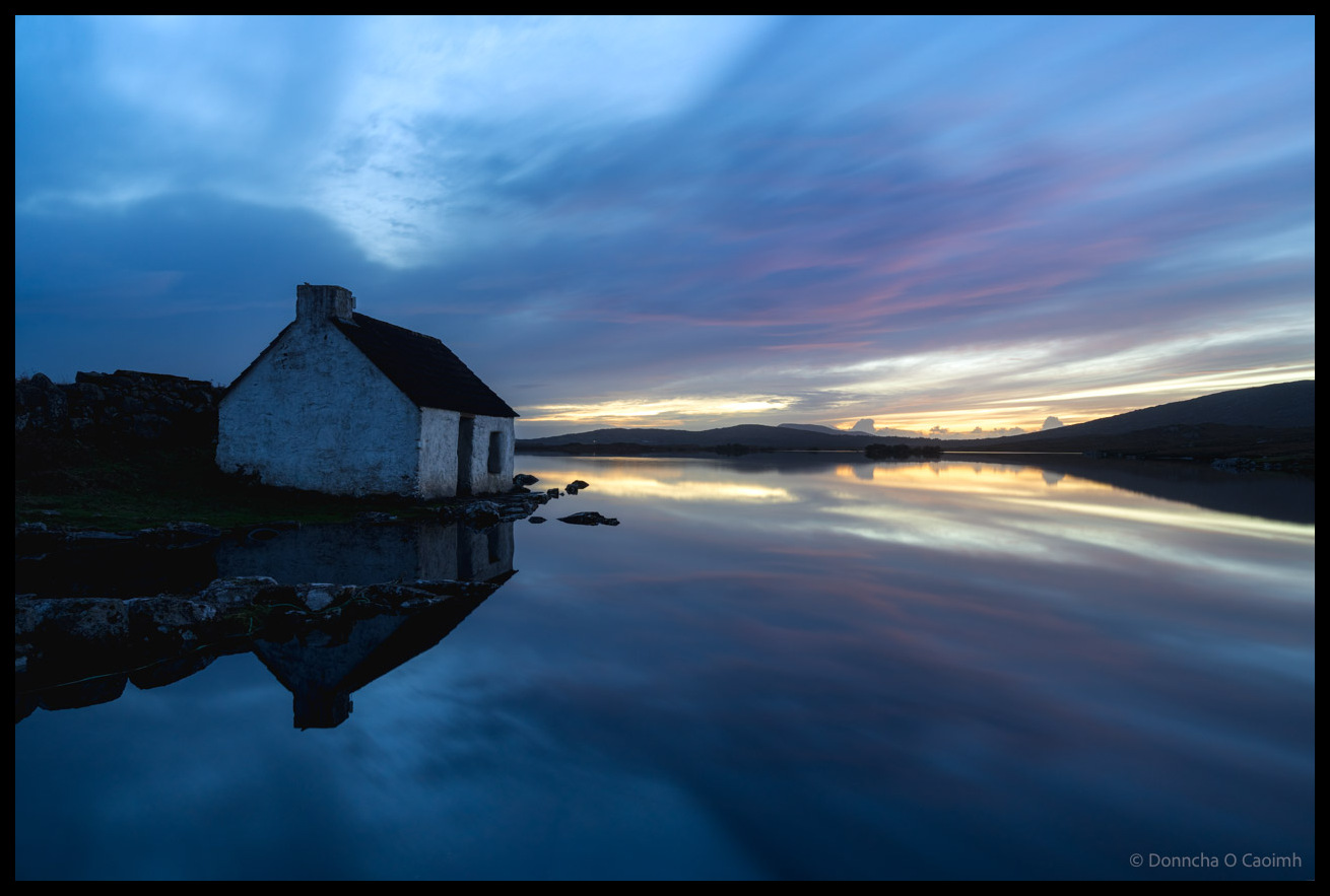 My first time visiting the famous fishing hut at Screebe in Connemara was last night, when we were blessed with an evening without even a breeze to disturb the water.