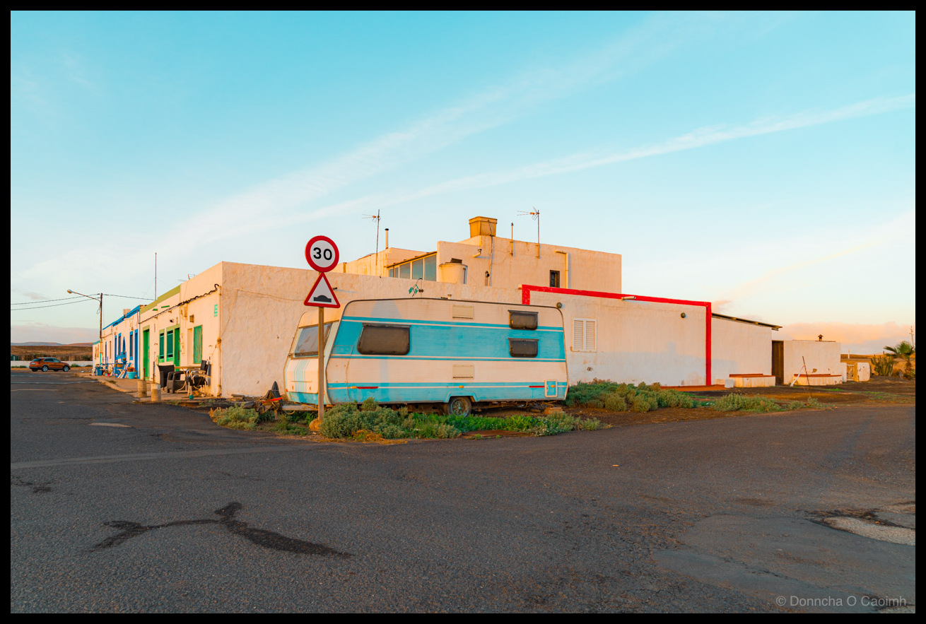 Early one morning outside the salt museum in Fuerteventura as the sun shone on nearby homes and a caravan parked next to the 30kph speed limit sign.