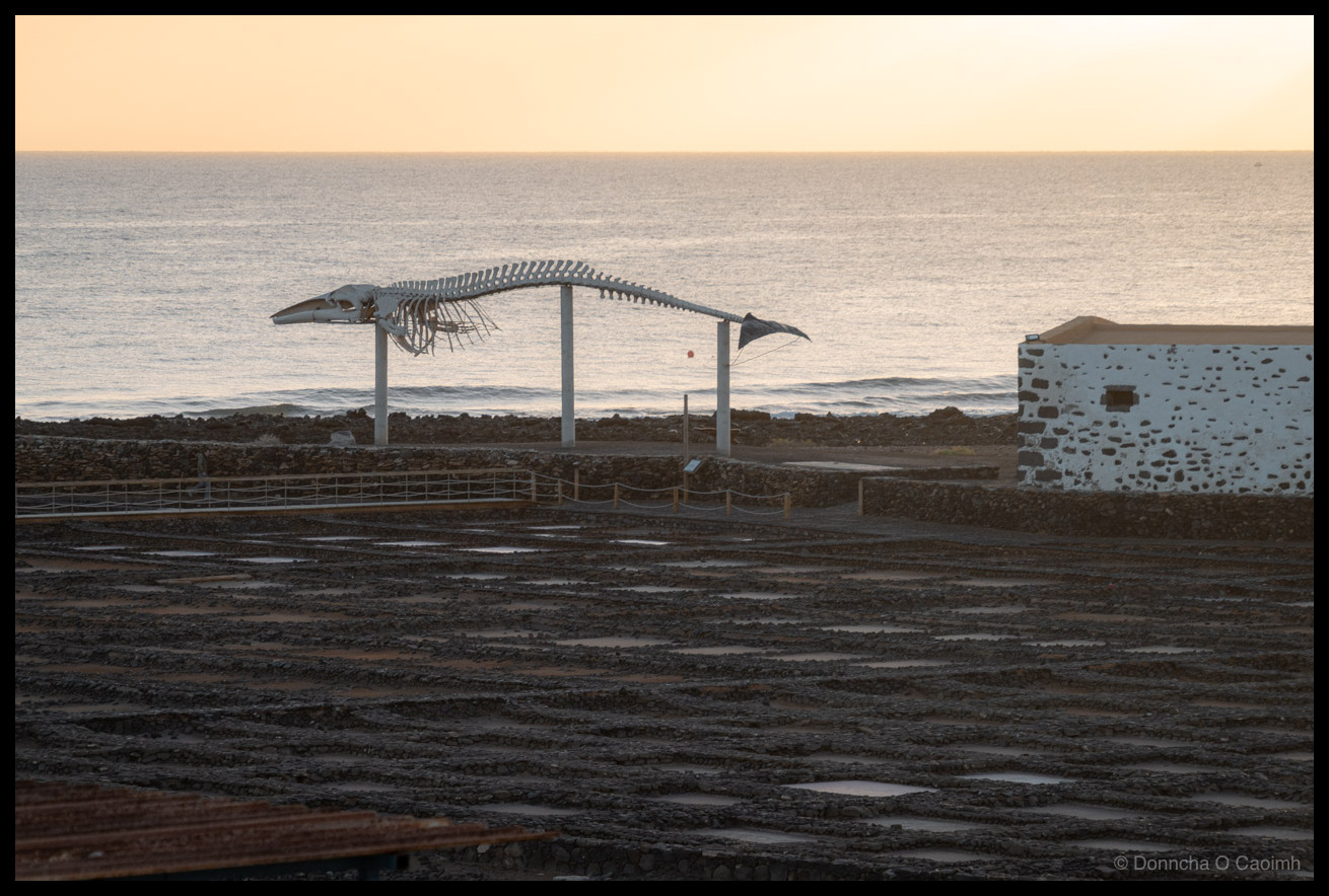 The cocederos, the shallow ponds where water evaporates and salt is collected, visible in the foreground in front of the fin whale skeleton at the Salt Museum in Fuerteventura.
