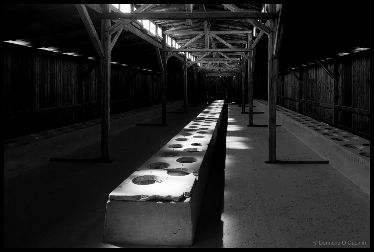 Walking through the preserved barracks at Auschwitz II-Birkenau confronts visitors with the stark reality of life and death in Nazi concentration camps. This photograph captures one of the sanitation sheds, where rows of crude concrete benches with circular openings served as communal toilets for thousands of prisoners.