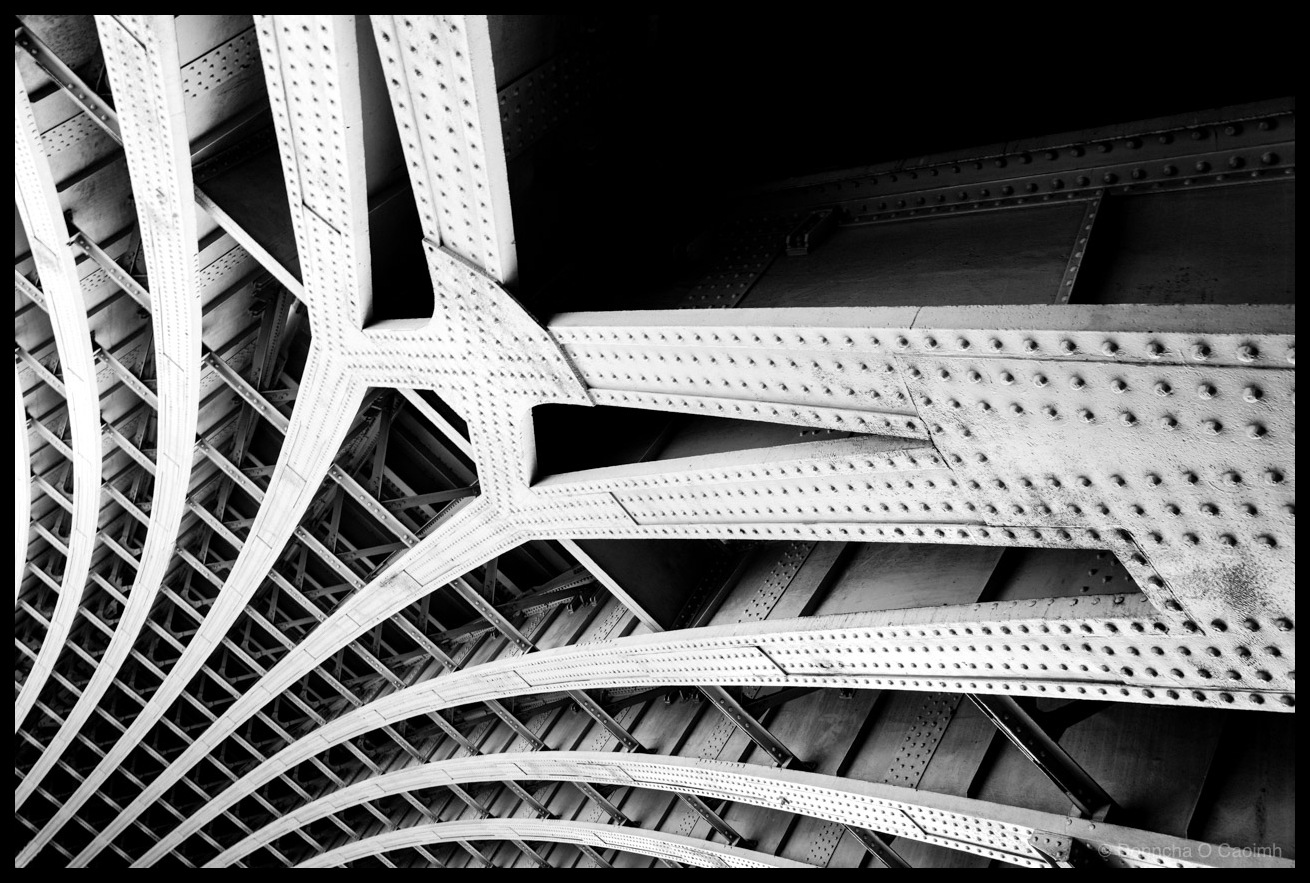 I nearly walked straight past it. You’re on the South Bank, dodging cyclists, and there’s this railway bridge overhead that most people treat as a ceiling to hurry under. But look up and the underside of Blackfriars Railway Bridge is a riot of riveted iron girders fanning out like the ribs of some enormous mechanical whale. I switched to black and white because the colour version was fighting the composition; stripping it back let the geometry do the talking.