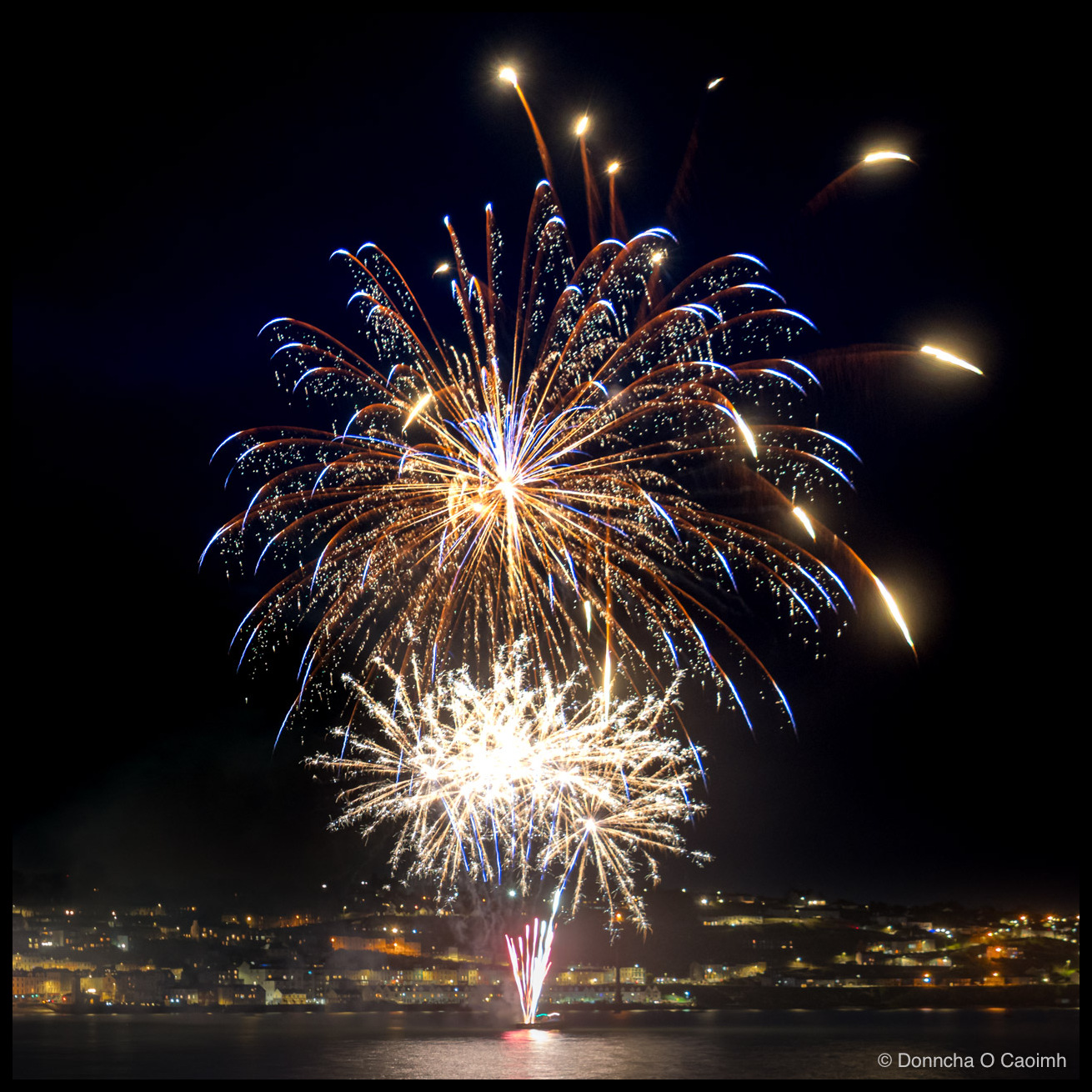 We were standing across from Cobh in the park on Haulbowline Island to photograph the fireworks display over Cobh on St. Patrick’s Day this year. With a camera on a tripod, timing a fireworks display is basically an exercise in optimistic guesswork. When I see the firework launch, I press the shutter button, hope a burst lands in frame, and try not to jostle the camera and tripod as the photo is taken. Sometimes if the burst is impressive I’ll forget to take my finger off the shutter button to stop the exposure which I think happened here. Luckily, this one landed well.