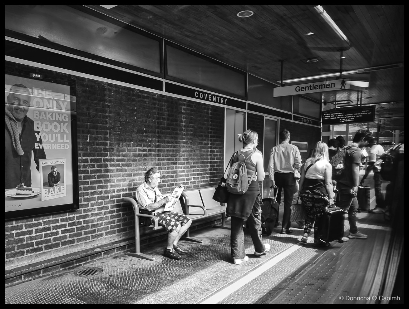 whose strap cuts across his chest. A huge Paul Hollywood stares down from an advert for the “only baking book you’ll ever need”, entirely ignored. The “Gentlemen” sign on the right, the “COVENTRY” lettering on the brickwork, the queue of travellers walking past and it all frames up nicely around him without him noticing at all. Which is the whole point, really.