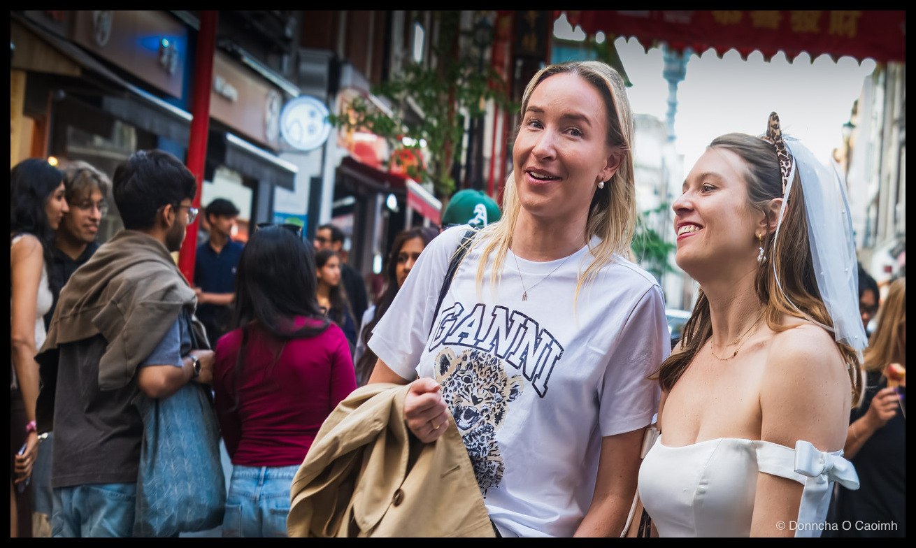 London Chinatown is a brilliant place to wander in a bridal veil. The pavement is so packed nobody quite registers it, and you can stand under a lantern eating something fried with an L-plate fluttering off your bag, and it just sort of fits. I barely noticed them before they were gone again into the crowd, swept away on a ladies weekend in the city.