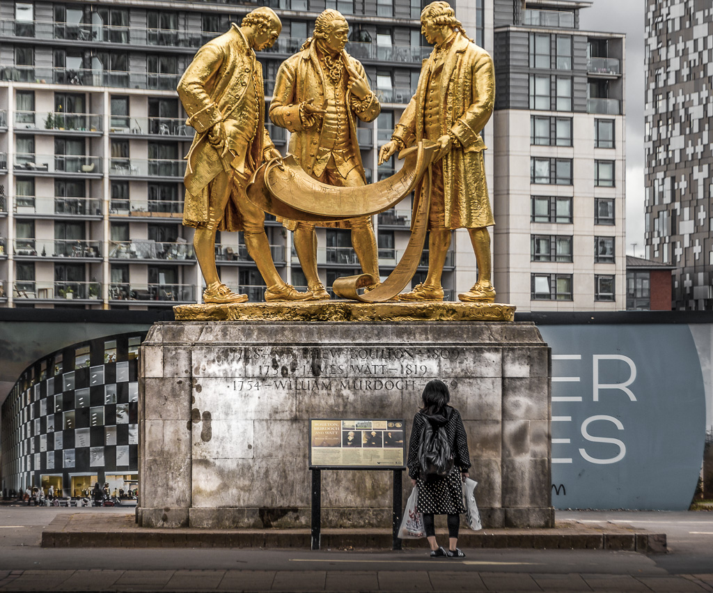 The gilded bronze statue of Matthew Boulton, James Watt and William Murdoch by William Bloye and Raymond Forbes-Kings stands on a plinth of Portland stone, outside the old Register Office on Broad Street in Birmingham, England.