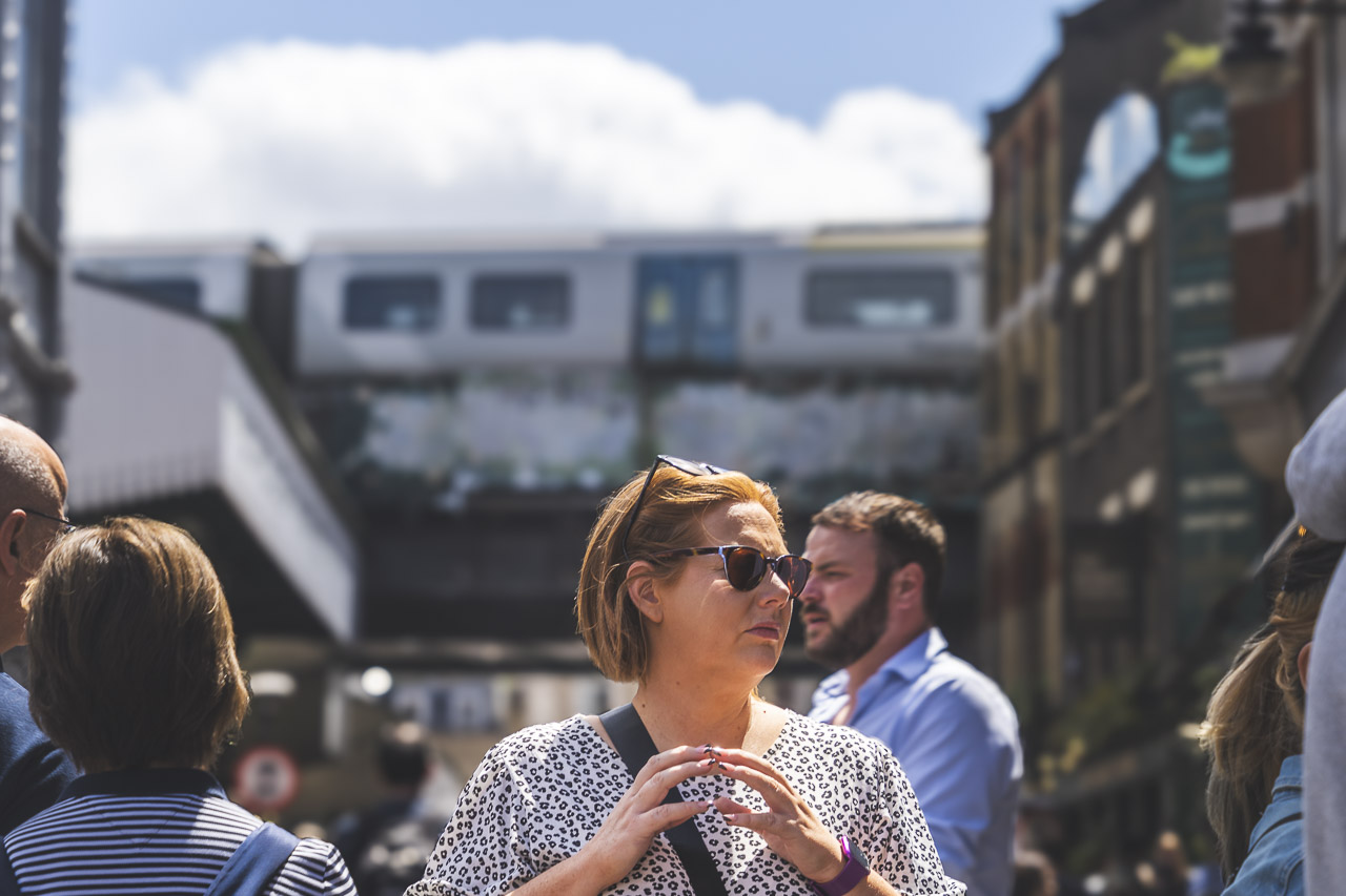 A woman, deep in thought, wondering what she’ll buy at a market in London a few years ago.
