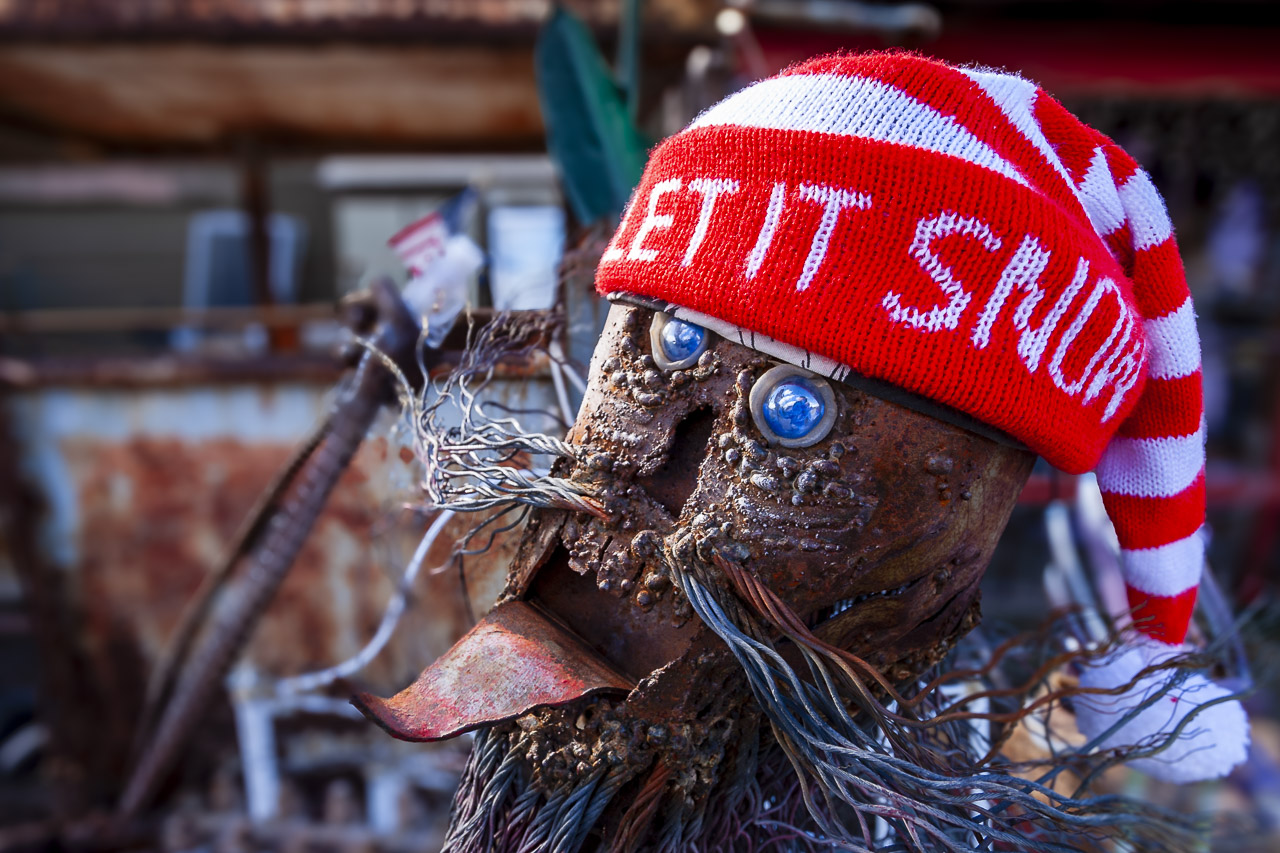 Many years ago, on a cold January day in Arizona we came across a small yard where metal works were being sold. One of those was an unusual metal robot with a red and white hat on it’s head, saying “LET IT SNOW”.